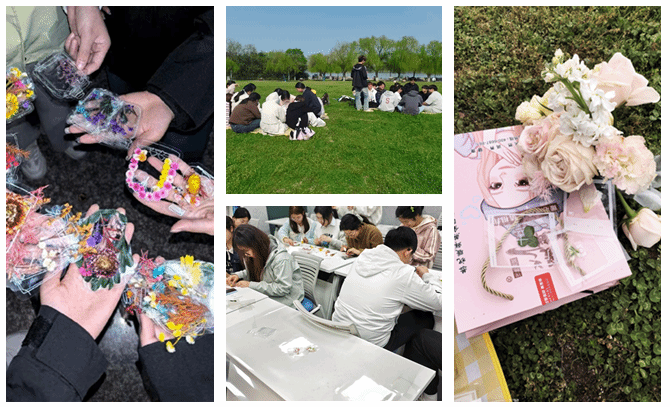生物科学和生物医学科学专业同学将自然美学、文学创作与志愿服务有机结合,举办了以“留住春天,传递温暖”为主题的特色主题团日活动。在书签制作区,同学们精心挑选各类干花枝叶,用透明模具将春日色彩封存于方寸之间。拼诗环节移步户外,大家在抽芽的树下,用词汇卡片在挂布上拼接出独属自己的春日诗句,在诗意氛围中舒缓情绪、激发创造力。活动最后,同学们将亲手制作的干花书签整理打包,作为爱心礼物捐赠给同学和老师,用小小的书签传递青春温暖。